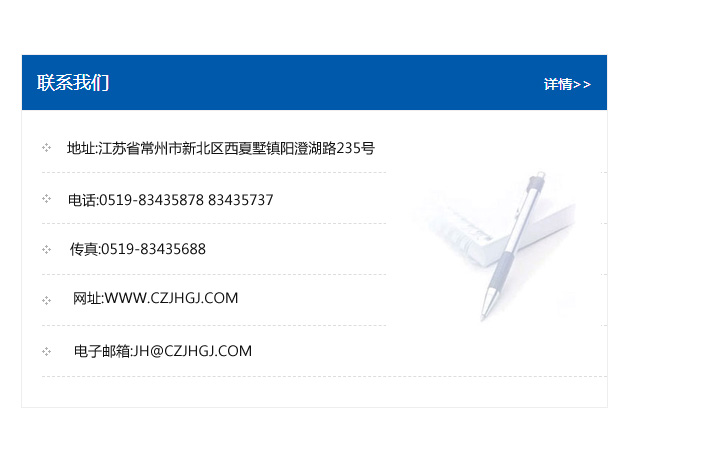 地址:常州市新北區友邦商務大廈1幢16、17層  電話:0519-85101652  傳真:0519-85112595  郵編:213022  網址:www.cz-jiayue_cn.jscjcj.com  郵箱:xiajifengaa@163.com